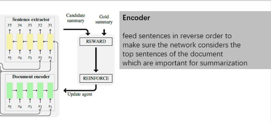 首先我们看编码过程,注意这里预先用 CNN 对每个句子进行编码,将其表示成embedding,再逐步输入 rnn 形式的 encoder 。有个小的注意点,即倒序输入句子,第一句话在最后一步输入,论文的解释是使得encoder 出来的向量更偏向第一句话,因为做摘要嘛,一般前几句话最重要,如下所示(摘自本人课件)