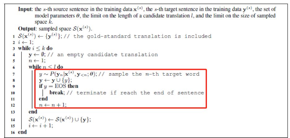 为此,我们需要通过采样的方法,来抽取训练过程中每一次所产生的序列集合。论文提供的方法,是在 decoder 的每个时间步,按照词的概率分布,来抽取单词(而不是像传统做法,直接取概率最大的),一直抽到结束,形成一个完整序列,然后重复 k 次,得到 k 个序列,组成一个子集。本质上是修改了 beam search 的过程,如下