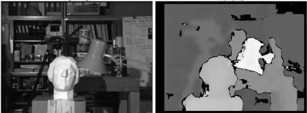 它的要旨在于从两个不同的角度看同一幅画,在两幅画中寻找相同的东西,并根据位置的不同推断深度。这叫做立体匹配。