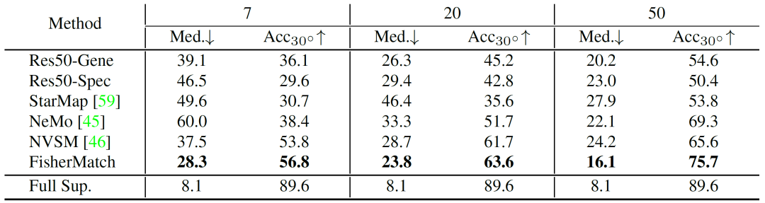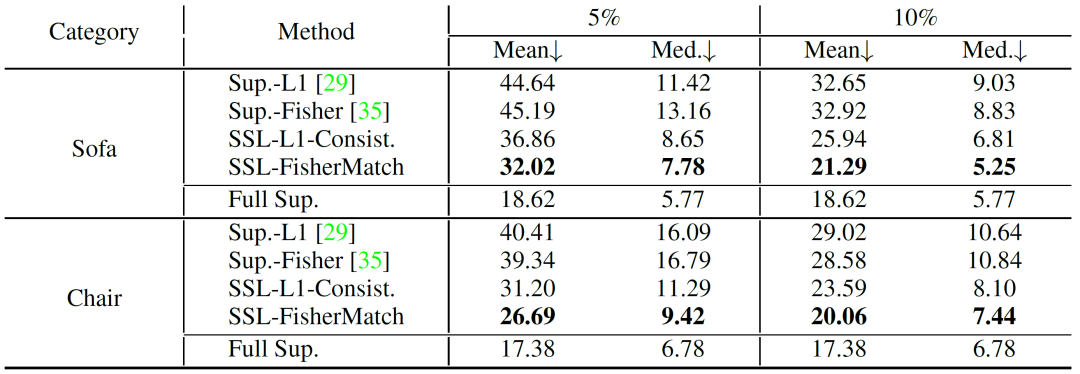 在 ModelNet10-SO(3) 和 Pascal3D+ 数据集上,我们将本文算法和多个基线算法进行对比,结果如图2、图3所示。实验结果证明,在多种标注数据比例的设定下,我们的算法显著优于其他算法,体现了方法的有效性。