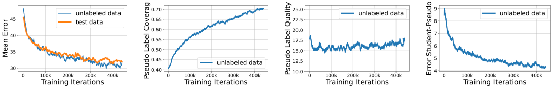 分析可知,随着半监督学习的进行,无标注数据的置信度不断上升,通过置信度筛选的伪标签比例越来越高,同时质量基本维持稳定,在无标注数据和测试数据上都获得明显的效果提升。