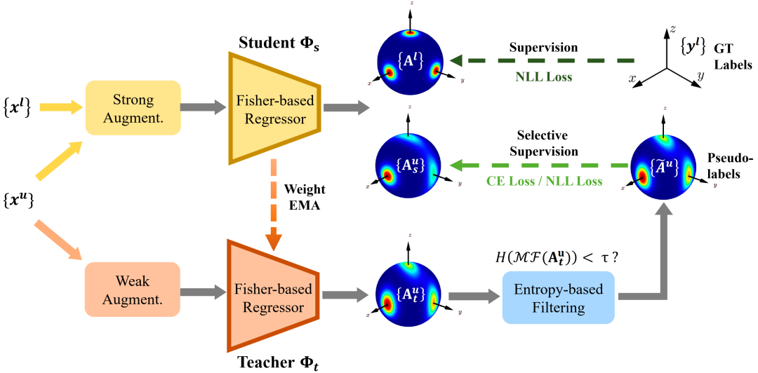 这此项工作中,我们首次提出了一个针对三维旋转回归的一般性的半监督学习算法 FisherMatch。该算法不局限于特定领域的知识,也不要求同一物体不同视角的图像对。借鉴在图像分类任务中广泛使用的半监督学习算法 FixMatch [1],我们采用师生共同学习框架,其中学生模型的参数是可学习的,而老师模型的参数是学生模型参数的指数移动平均数(exponential moving average)。有标注数据和其对应真值用于训练学生模型,而无标注数据则使用由老师模型输出的“伪标签”进行监督,因而构建了师生模型之间的历史一致性。