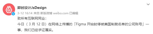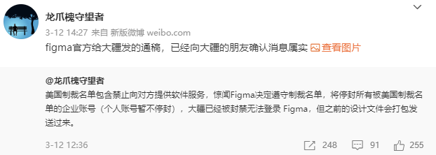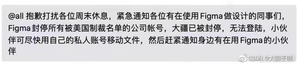 知群 CEO @马力在知群 也发布了相关通知截图:“紧急通知各位有在使用 Figma 做设计的同事们,Figma 封停所有被美国制裁名单的公司账号,大疆已被封停,无法登录,小伙伴可尽快用自己的私人账户移动文件,然后赶紧通知身边有在用 Figma 的小伙伴。”