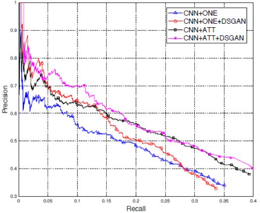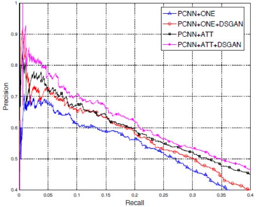 从图中可以看出,经过DSGAN降噪之后,基于CNN和基于PCNN的模型在关系抽取任务上的表现都有着显著的提升。