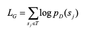 表示)、得分低于阈值的标注为正例(该数据由T表示),重新标注后的句子输入到判别模型中,将判别模型的判决结果作为生成模型反向求导调参的依据。这里生成模型的损失函数如公式(1)所示: