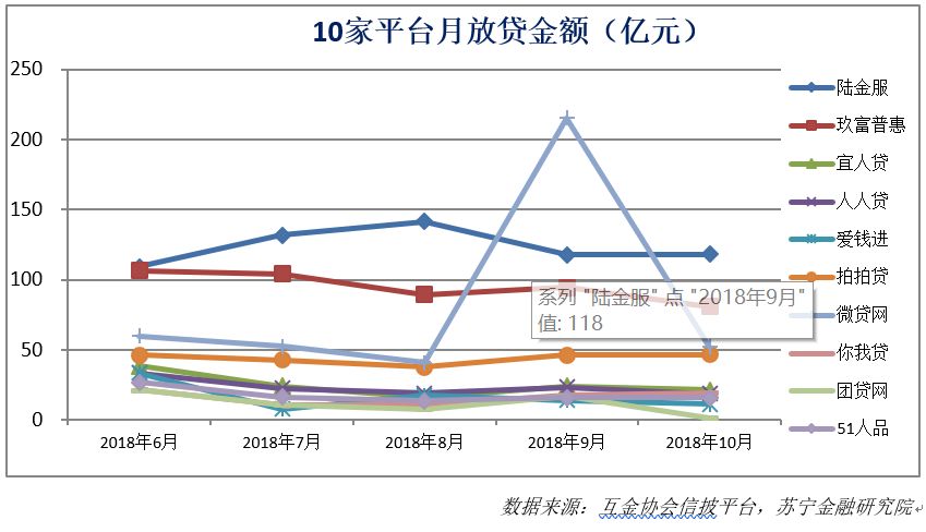 以截止2018年10月末待还余额排序,本文选择陆金服、玖富普惠、宜人贷、人人贷、爱钱进、拍拍贷、微贷网、你我贷、团贷网和51人品等10家平台(下称“前10大平台”)作为头部平台代表,进行如下分析。