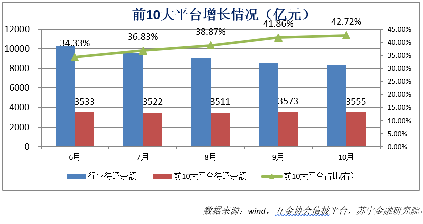 首先,当前的行业环境下,头部平台的市场地位在提升。2018年6月-10月,行业待还余额从10292亿元降至8323亿元,降幅为19.14%;前10大平台则实现了待还余额的基本稳定,微增22亿元,市场集中度从34.33%提升至42.72%,4个月内提高了8.39个百分点。