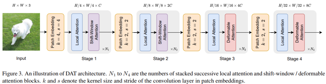 该研究在 Transformer(等式 (4))中的可变形注意力替换了 vanilla MHSA,并将其与 MLP(等式 (5))相结合,以构建一个可变形的视觉 transformer 块。在网络架构方面, DAT 与 [7, 26, 31, 36] 共享类似的金字塔结构,广泛适用于需要多尺度特征图的各种视觉任务。如下图 3 所示,形状为 H × W × 3 的输入图像首先被步长为 4 的 4 × 4 非重叠卷积嵌入,然后一个归一化层获得