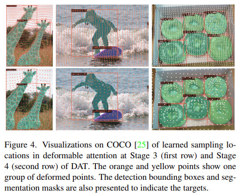 该研究在 DAT 中可视化学习变形位置的示例,以验证该方法的有效性。如下图 4 所示,采样点描绘在对象检测框和实例分割掩码的顶部,从中可以看到这些点已转移到目标对象。