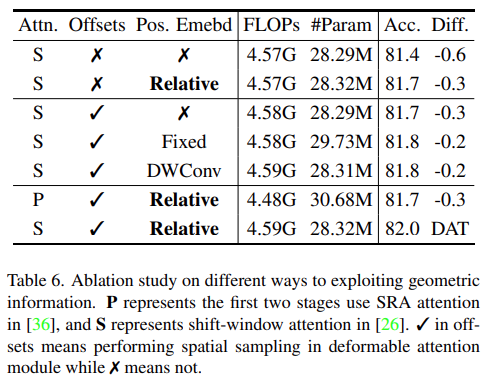 为了验证 DAT 模型中关键组件设计的有效性, 该研究进行了消融实验,报告了基于 DAT-T 的 ImageNet-1K 分类结果。对于几何信息开发,该研究首先评估了所提可变形偏移和可变形相对位置嵌入的有效性,如下表 6 所示。