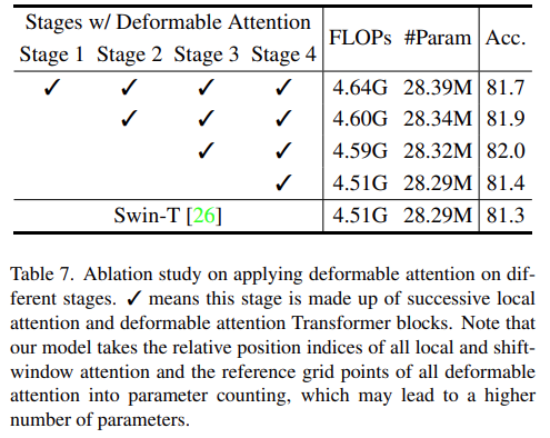对于不同阶段的可变形注意力,该研究用不同阶段的可变形注意力替换了 Swin Transfomer [26] 的移位窗口注意力。如下表 7 所示,仅替换最后阶段的注意力提高了 0.1,替换最后两个阶段导致性能增益为 0.7(达到 82.0 的整体准确度)。然而,在早期阶段用更多可变形注意力替换会略微降低准确性。