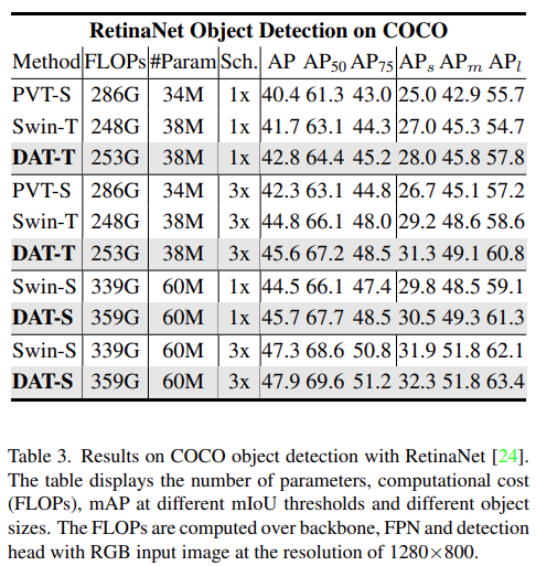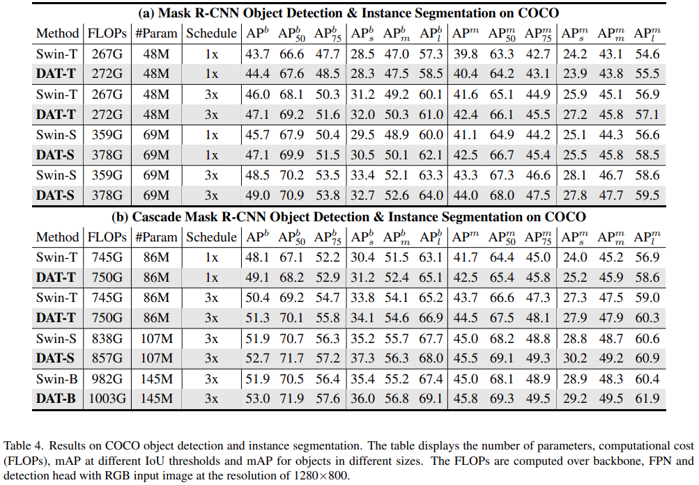 当在两阶段检测器(例如 Mask R-CNN、Cascade Mask R-CNN)中实现时,DAT 模型在不同尺寸的 Swin Transformer 模型上实现了一致的改进,如下表 4 所示。