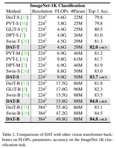 ImageNet-1K [10] 数据集有 128 万张用于训练的图像和 5 万张用于验证的图像。研究者在训练分割上训练 DAT 的三个变体,并报告验证分割上的 Top-1 准确度,并与其他 Vision Transformer 模型进行比较。