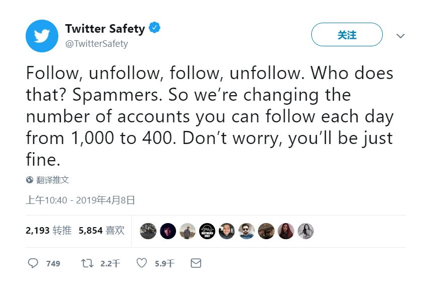 新榜讯 4月8日,Twitter发布公告称,为了整顿垃圾邮件发送者,Twitter对用户每日关注数进行了修改,从1000个降低为400个。