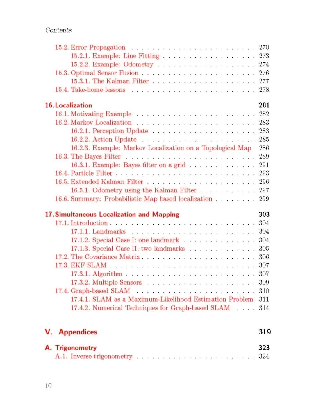 虽然属于“人工智能”的范畴,但标准的人工智能技术还不足以解决涉及不确定性的问题,比如机器人在现实世界中的互动。这本书使用简单的三角函数来发展机械臂和移动机器人的运动学方程,然后介绍路径规划、传感和最后的不确定性。通过对误差传播的形式化定义,引入了机器人定位问题,包括马尔可夫定位、粒子滤波和扩展卡尔曼滤波,以及同时定位和映射。本书的重点不是集中在一个特定的子问题的最先进的解决方案上,而是通过反复出现的例子来抓住问题的本质,逐步发展概念。所描述的解决方案不一定是最好的,但是它们很容易理解并在社区中广泛使用。例如,里程计和直线拟合分别用于解释正向运动学和最小二乘解决方案,随后作为定位上下文中的误差传播和卡尔曼滤波的激励示例。