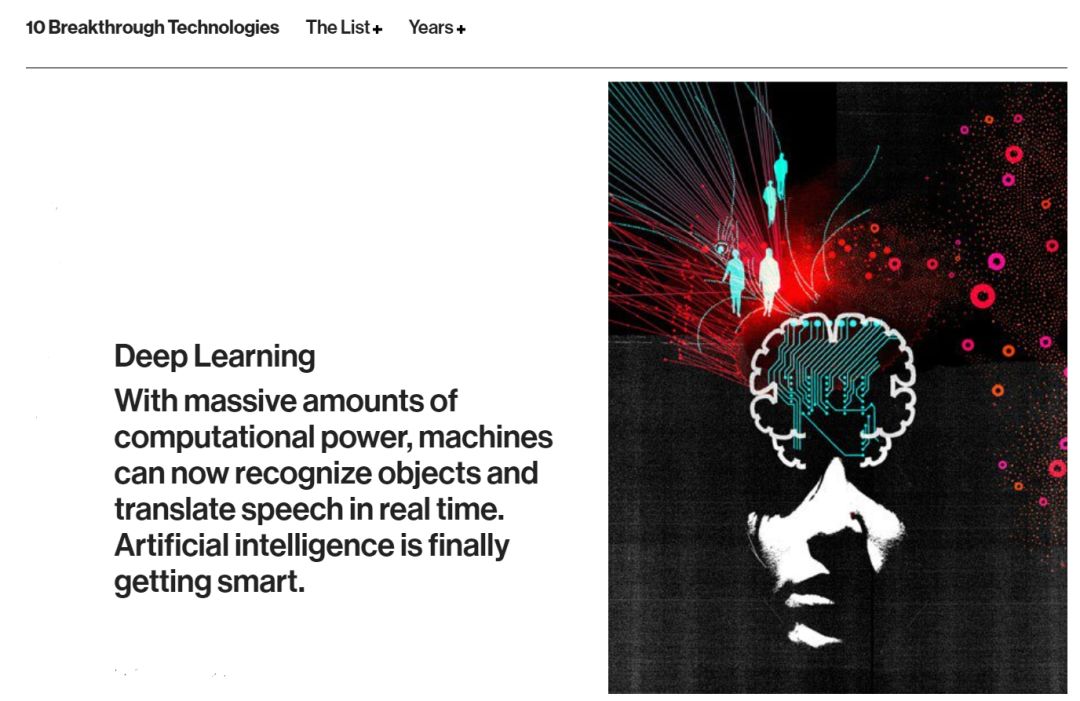 同在库兹韦尔入职谷歌的 2013 年初,《麻省理工科技评论》发布了当年的“十大突破性技术”(TR10),“深度学习”作为上榜技术赫然在列,并给出了 3 - 5 年内即将爆发的明确时间周期。