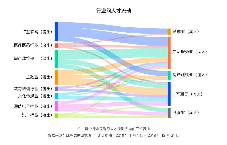 2019年,生活服务业取代金融行业,成为IT互联网人才离职后的首要去处,金融业和房产建筑业分别位列二三位。
