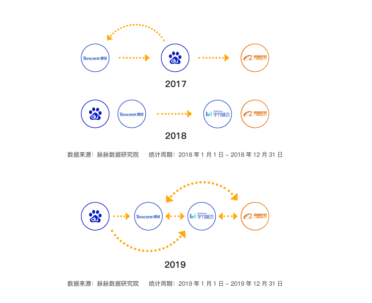 脉脉大数据显示,2017年时BAT人才间的流动还是三家之间的“三国演义”。到了2018年,字节跳动强势加入,成为百度和腾讯人才的去向之一。2019年再接再厉,与AT两家组成新的BAT人才库。