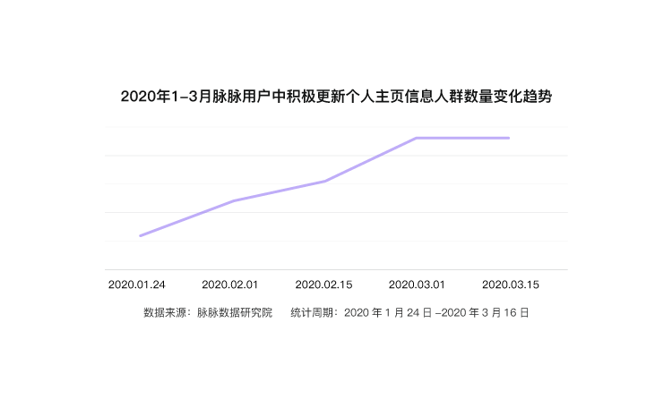 脉脉平台大数据显示,自春节以后,脉脉上更新个人主页的人数呈显著上升趋势,在3月初达到高峰并一直延续。个人主页可以理解为个人的职场经历与个人职业品牌,这一行为变化显示,疫情并未封住职场人对“机遇”的期待,反而出于抵御风险等考虑,进一步加强了职场人自我提升的愿望。职场人已经在为机遇的到来做各种准备。