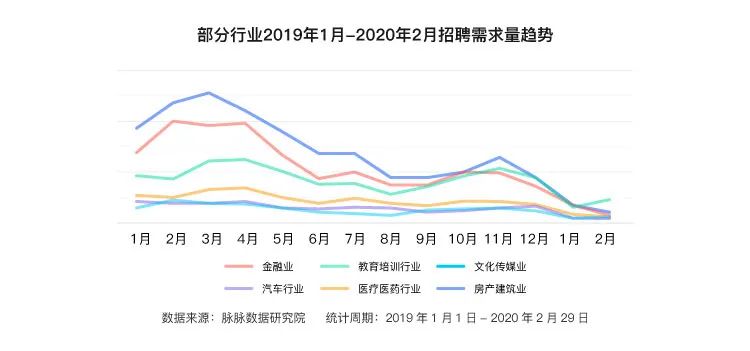 脉脉大数据显示,2019年包括互联网、金融、文化传媒在内的多个行业人才出现流出,而行业趋势交叠疫情影响,则让不同行业的招聘需求开始出现分化趋势。