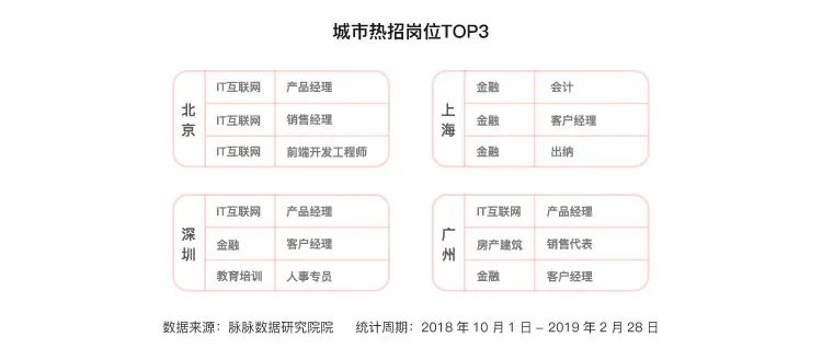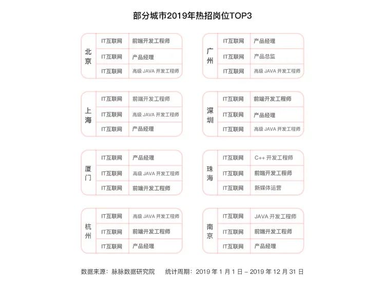 2019年,各城市继续力推互联网等新经济产业,尤以上海最为显著。2018年的数据可以发现,上海主要对金融人才的需求最为旺盛。而2019年热招的岗位TOP3则都变成了互联网相关岗位,且以开发等技术岗为主。2019年,以拼多多、小红书、B站等为代表的上海互联网企业,显著推高了上海互联网人才的需求。
