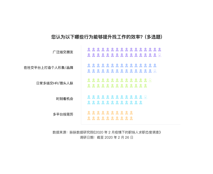 脉脉的2月求职态度调查显示,63%的职场人认为人脉能够提升找工作的效率,认为打造个人品牌也可以提升求职效率的占比59%。