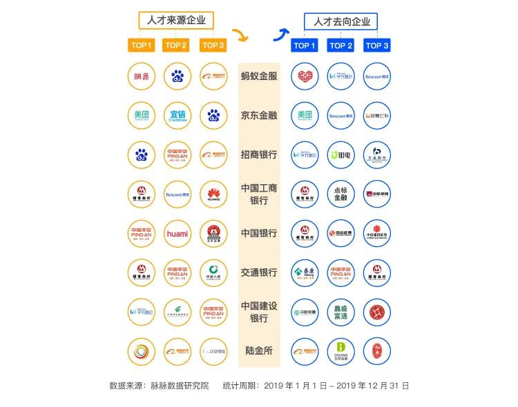 蚂蚁金服、京东金融等有互联网基因的金融公司,仍以互联网公司间流动为主。传统银行中,国有四大行人才主要仍是在金融证券类公司之间流动,而总部位于深圳的招商银行,则“互联网化”了许多,不管是流入还是流出,都有不少阿里、字节跳动等互联网公司的身影。