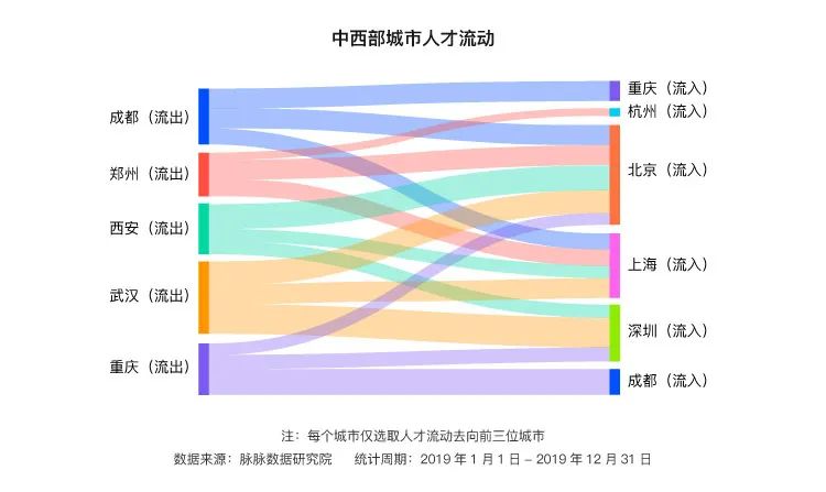 中西部城市人才流动则仍以圈外流动为主。唯一的圈内频密流动,发生在成都与重庆之间。