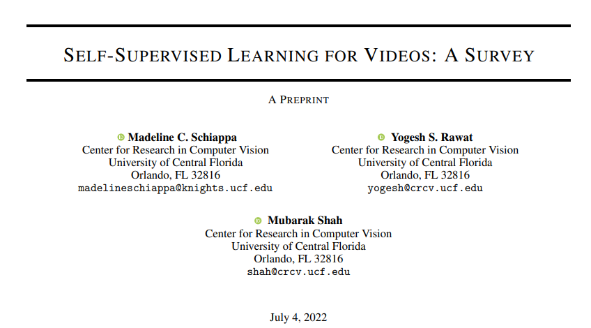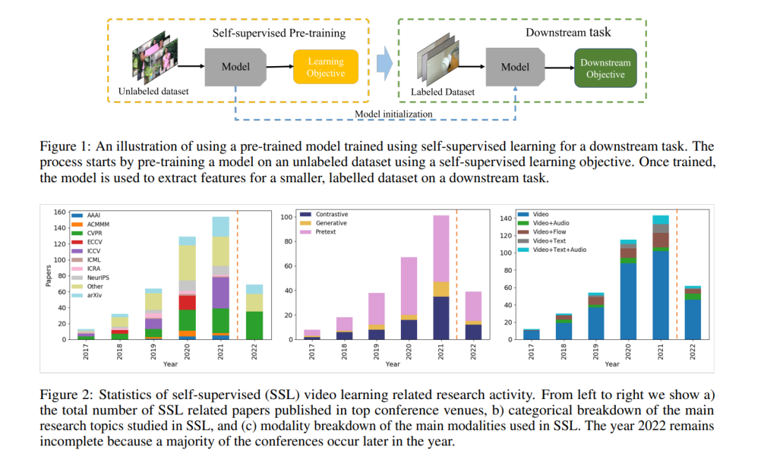 深度学习在各个领域的显著成功依赖于大规模注释数据集的可用性。然而,使用人工生成的注释会导致模型有偏差学习、领域泛化能力差和鲁棒性差。获取注释也很昂贵,需要付出很大的努力,这对视频来说尤其具有挑战性。作为另一种选择,自监督学习提供了一种不需要注释的表示学习方法,在图像和视频领域都显示出了前景。与图像域不同,学习视频表示更具有挑战性,因为时间维度,引入了运动和其他环境动力学。这也为在视频和多模态领域推进自监督学习的独家想法提供了机会。在这项综述中,我们提供了一个现有的方法在视频领域的自监督学习重点。我们根据它们的学习目标将这些方法总结为三种不同的类别: 1) 文本预置任务,2) 生成式建模,和 3)对比学习。这些方法在使用的方式上也有所不同; 1) video, 2) video-audio, 3) video-text, 4) video-audio-text。我们进一步介绍了常用的数据集、下游评估任务、现有工作的局限性以及该领域未来的潜在方向。