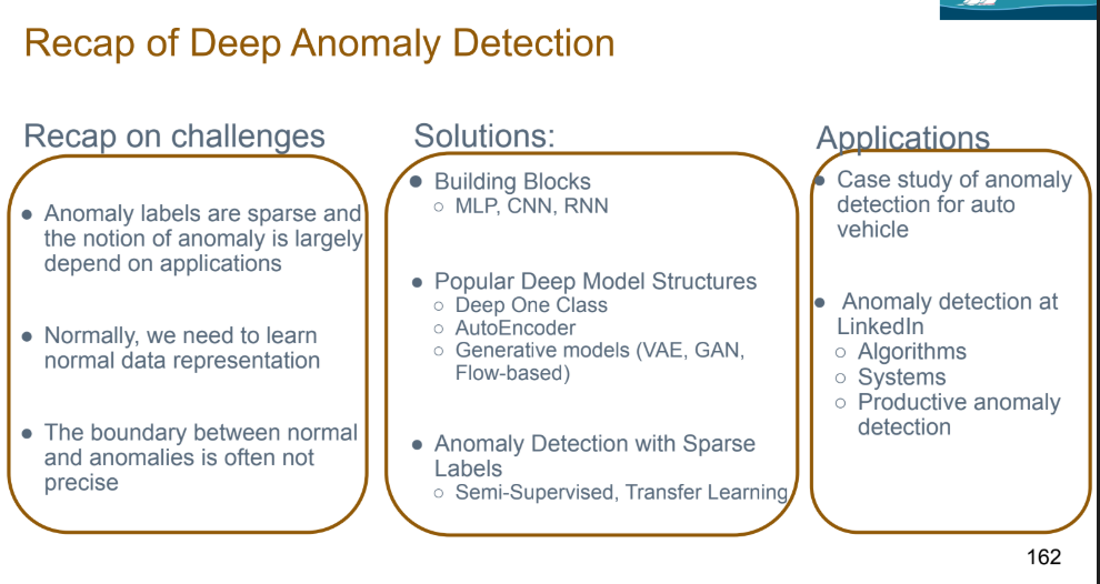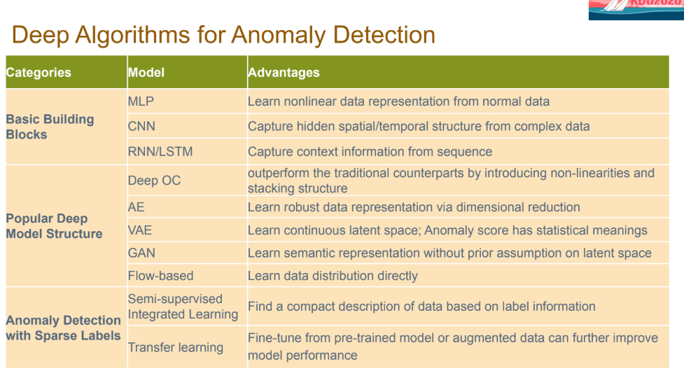异常检测已经得到了广泛的研究和应用。建立一个有效的异常检测系统需要研究者和开发者从嘈杂的数据中学习复杂的结构,识别动态异常模式,用有限的标签检测异常。与经典方法相比,近年来深度学习技术的进步极大地提高了异常检测的性能,并将异常检测扩展到广泛的应用领域。本教程将帮助读者全面理解各种应用领域中基于深度学习的异常检测技术。首先,我们概述了异常检测问题,介绍了在深度模型时代之前采用的方法,并列出了它们所面临的挑战。然后我们调查了最先进的深度学习模型,范围从构建块神经网络结构,如MLP, CNN,和LSTM,到更复杂的结构,如自动编码器,生成模型(VAE, GAN,基于流的模型),到深度单类检测模型,等等。此外,我们举例说明了迁移学习和强化学习等技术如何在异常检测问题中改善标签稀疏性问题,以及在实际中如何收集和充分利用用户标签。其次,我们讨论来自LinkedIn内外的真实世界用例。本教程最后讨论了未来的趋势。