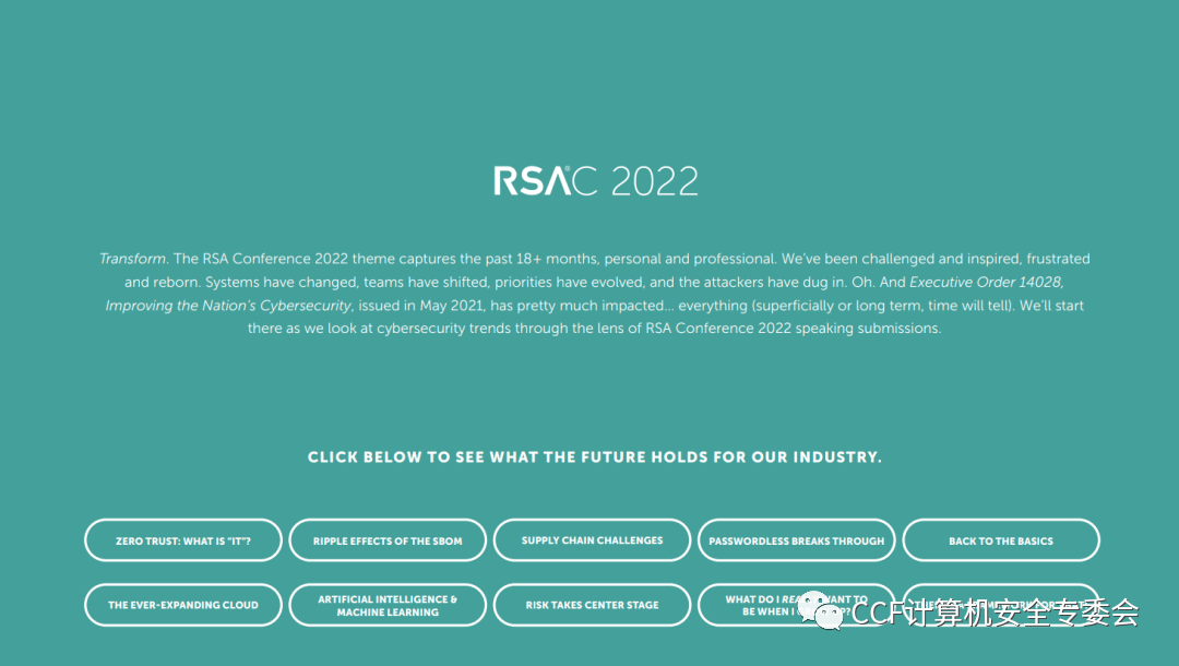 RSA大会每年都会有一个主题,本次大会的主题为Transform(转型)。提到转型,大家都不陌生,数字化转型是我国十四五规划的关键词。2022年的主题Transform(转型)是去年RSA大会主题Resilience(弹性)[3]的进一步延伸。弹性者,指的是小到企业面临网络攻击的应急和恢复,大到企业在疫情期间的存续和发展,这是转型的目的和意义。
