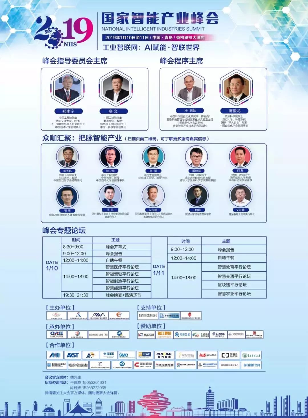 由中国自动化学会理事长郑南宁院士、中国计算机学会理事长高文院士共同担任指导委员会主席,中国自动化学会监事长、中科院自动化研究所研究员王飞跃与中国自动化学会副理事长、澳门大学讲座教授、欧洲科学院院士陈俊龙共同担任峰会程序主席的2019国家智能产业峰会将于2019年1月10日至11日在青岛举行。峰会广邀从事深度研究的科技专家、洞察行业发展趋势的产业大咖、助力科技创新的金融机构,论道智能产业发展趋势,共话智能产业未来!无论是在会议议题、嘉宾阵容还是会议规模上,本次峰会都堪称国内顶级的智能产业盛会。