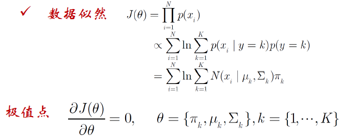 推断图象所对应的状态,事实上就是逼近z所对应的后验概率的过程,计算出观测数据对应的类型或者类型分布后,就可以进行参数的估计了,在非监督学习下,最常用的参数估计方法就是极大似然法,一般做法是选定目标函数,然后相对于我们要求解的参数进行求导,找出极值点: