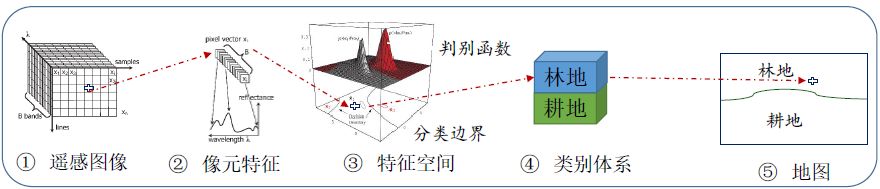 对于遥感图像而言,语义分割不是一个新的概念。在遥感图像分类的研究中,最开始研究者就想实现对一幅图像在每个像元上给出一个语义类别。最典型的方法就是提取像元的特征,对于每个像元的特征,通过一些算法对特征空间进行分割之后,判断像元处于特征空间的什么位置,据此从给定的类别集中选择一个类别,就可以把所有的像元结合在一起,形成一个专题地图,具体流程如下图所示。这种方法和我们刚才的语义分割达到的目的一样,区别是这种方法是基于像元实现分类。
