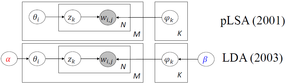 这就是pLSA模型,pLSA模型有一个问题,就是模型的参数会随着文章数量、主题个数或词数量的增加而增加,参数多了之后会变的非常复杂,容易造成过拟合,为了解决这个问题,在此基础进行修改,得到LDA模型: