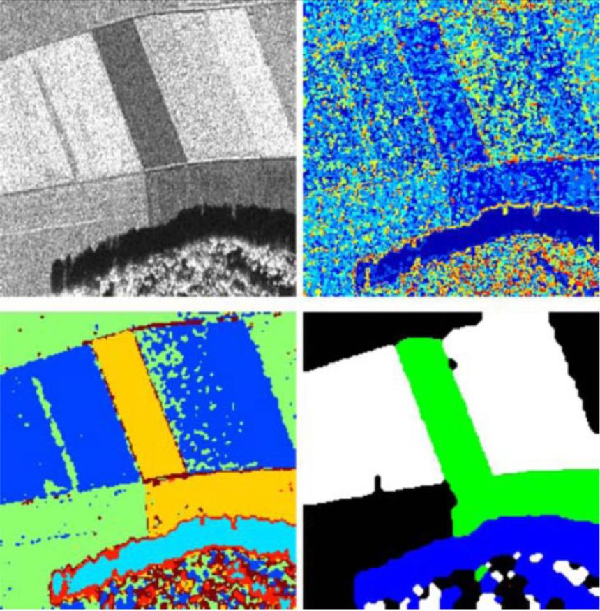 其中左上图是初始的SAR图象,如果纯粹的用CRP进行聚类,就相当于使用类数不给定的一个高斯混合模型,那么得出的结果如右上所示,可以看出斑点很多,结果不好。左下图是增加了Markov先验约束相对弱一点的情况,右下图是约束强一点的情况,可以看出空间一致性得到了增强。