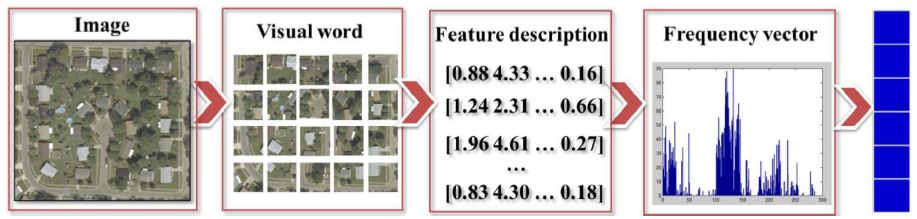 要使用主题模型,必须想办法用词袋模型表征待分析对象。在图像应用中,假设一张图像对应一篇文章,原来连续的一些特征对应的就是文章中的词。预处理过程和刚才的词袋模型表示过程一样,先进行特征提取,然后形成一个字典,根据字典统计出直方图。在遥感图像中,如果我们把一级影像看成一个餐馆的话,数据量太大。那么就要进行语义分割问题,我们需要把图像切成小的图像,然后将小的图象当成一篇文章,或者上文提到的一个餐馆: