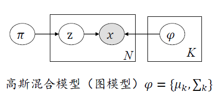 图中,圆圈代表随机变量,涂黑的部分表示图像像元或其特征,圆圈之间的箭头表示依赖关系。例如x观测量会依赖z和φ,其中φ就是高斯模型中的参数。
