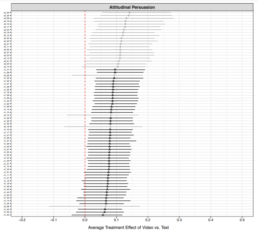 上图为「说服力」效应对比,即改变参与者态度或行为的水平。可以看到,整体效应更趋近于相同,视频仅仅稍占优势。