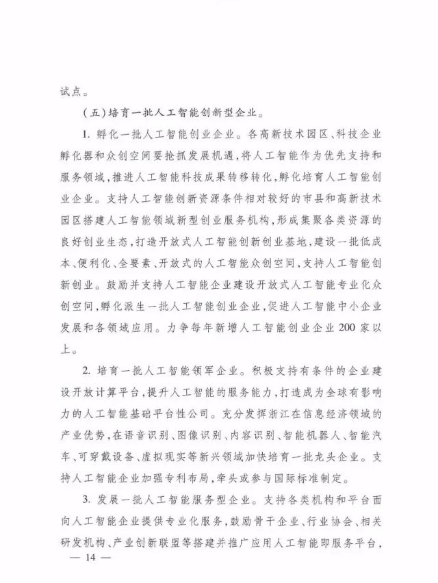 2.培育一批人工智能领军企业。积极支持有条件的企业建设开放计算平台,提升人工智能的服务能力,打造成为全球有影响力的人工智能基础平台性公司。充分发挥浙江在信息经济领域的产业优势,在语音识别、图像识别、内容识别、智能机器人、智能汽车、可穿戴设备、虚拟现实等新兴领域加快培育一批龙头企业。支持人工智能企业加强专利布局,牵头或参与国际标准制定。