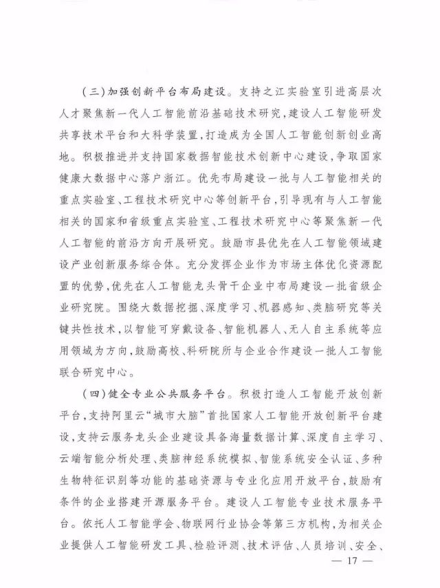 (三)加强创新平台布局建设。支持之江实验室引进高层次人才聚焦新一代人工智能前沿基础技术研究,建设人工智能研发共享技术平台和大科学装置,打造成为全国人工智能创新创业高地。积极推进并支持国家数据智能技术创新中心建设,争取国家健康大数据中心落户浙江。优先布局建设一批与人工智能相关的重点实验室、工程技术研究中心等创新平台,引导现有与人工智能相关的国家和省级重点实验室、工程技术研究中心等聚焦新一代人工智能的前沿方向开展研究。鼓励市县优先在人工智能领域建设产业创新服务综合体。充分发挥企业作为市场主体优化资源配置的优势,优先在人工智能龙头骨干企业中布局建设一批省级企业研究院。围绕大数据挖掘、深度学习、机器感知、类脑研究等关键共性技术,以智能可穿戴设备、智能机器人、无人自主系统等应用领域为方向,鼓励高校、科研院所与企业合作建设一批人工智能联合研究中心。