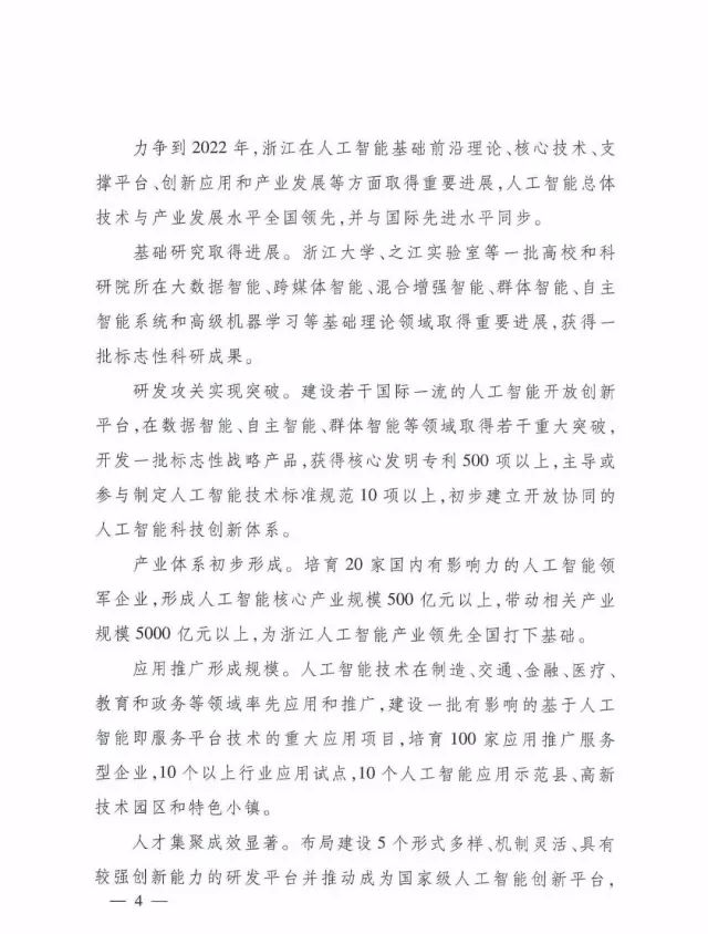 力争到2022年,浙江在人工智能基础前沿理论、核心技术、支撑平台、创新应用和产业发展等方面取得重要进展,人工智能总体技术与产业发展水平全国领先,并与国际先进水平同步。