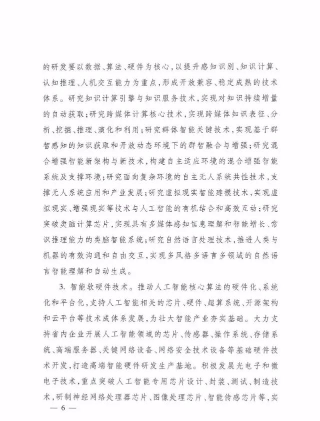 3.智能软硬件技术。推动人工智能核心算法的硬件化、系统化和平台化,支持人工智能相关的芯片、硬件、超算系统、开源架构和云平台等技术成体系发展,为壮大智能产业夯实基础。大力支持省内企业开展人工智能领域的芯片、传感器、操作系统、存储系统、高端服务器、关键网络设备、网络安全技术设备等基础硬件技术开发,打造高端智能硬件研发生产基地。积极发展光电子和微电子技术,重点突破人工智能专用芯片设计、封装、测试、制造技术,研制神经网络处理器芯片、图像处理芯片、智能传感芯片等,实现高端智能芯片跨越式发展。研制大数据环境下人工智能新范式统一计算框架平台和超算系统,为人工智能研究提供所需的各种工具集组件。优先支持国产智能操作系统的研发和产业化应用,研究面向人工智能优化的操作系统、中间件、开发工具等软件技术。加快发展以自动控制与感知技术、核心工业软硬件、工业互联网、工业云和智能服务平台为核心的工业自主软件技术体系,提升制造业与互联网融合的有效供给能力。加强研究开发新一代人工智能关键材料,努力建成国内重要的人工智能高端材料生产基地。
