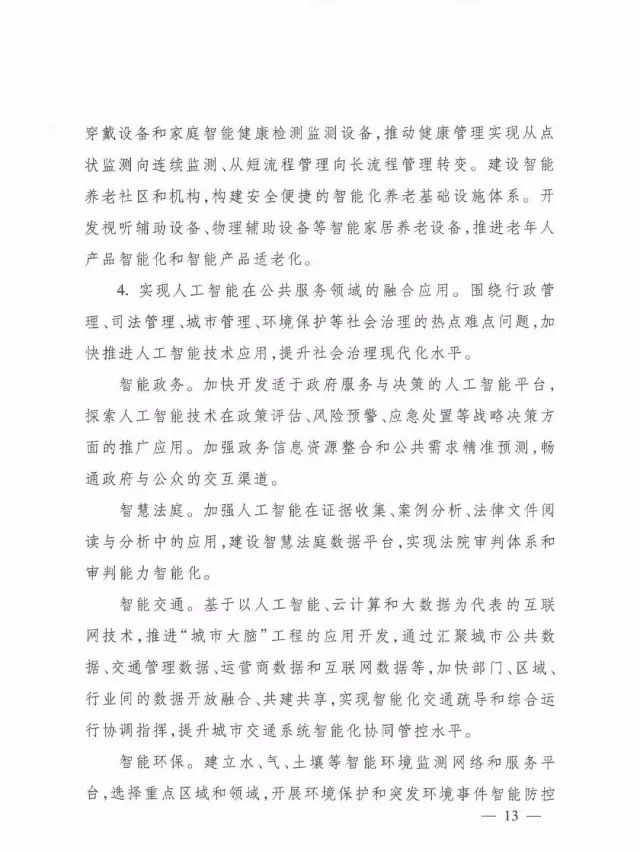 4.实现人工智能在公共服务领域的融合应用。围绕行政管理、司法管理、城市管理、环境保护等社会治理的热点难点问题,加快推进人工智能技术应用,提升社会治理现代化水平。