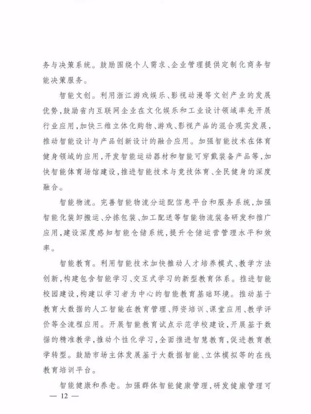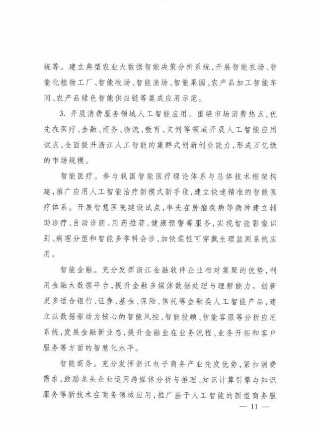 3.开展消费服务领域人工智能应用。围绕市场消费热点,优先在医疗、金融、商务、物流、教育、文创等领域开展人工智能应用试点,全面提升浙江人工智能的集群式创新创业能力,形成万亿级的市场规模。