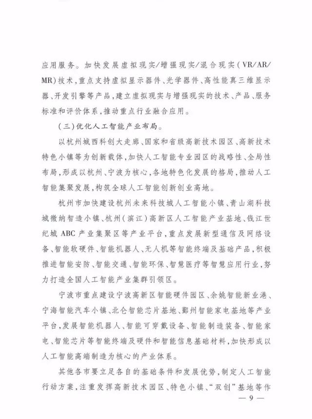 以杭州城西科创大走廊、国家和省级高新技术园区、高新技术特色小镇等为创新载体,加快人工智能专业园区的战略性、全局性布局,形成以杭州、宁波为核心,各地特色化发展的格局,推动人工智能集聚发展,构筑全球人工智能创新创业高地。