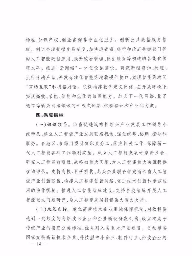 (四)健全专业公共服务平台。积极打造人工智能开放创新平台,支持阿里云“城市大脑”首批国家人工智能开放创新平台建设,支持云服务龙头企业建设具备海量数据计算、深度自主学习、云端智能分析处理、类脑神经系统模拟、智能系统安全认证、多种生物特征识别等功能的基础资源与专业化应用开放平台,鼓励有条件的企业搭建开源服务平台。建设人工智能专业技术服务平台。依托人工智能学会、物联网行业协会等第三方机构,为相关企业提供人工智能研发工具、检验评测、技术评估、人员培训、安全、标准、知识产权、创业咨询等专业化服务。创新公共数据服务管理。制订合理数据交易制度,加快运营商、银行和政府关键部门等的人工智能数据应用,提升政府管理、民生服务等领域的智能化管理水平。推进“云网端”一体化设施建设。研究新型感知、处理、执行终端产品,开发标准化智能终端软硬件接口,实现智能终端间“万物互联”和机器对话。积极构建软件定义网络,在开放环境下实现高效、节能、智能和优化的组网能力。加大下一代网络、量子通信等新兴网络领域的开放式创新、试验验证和产业化力度。