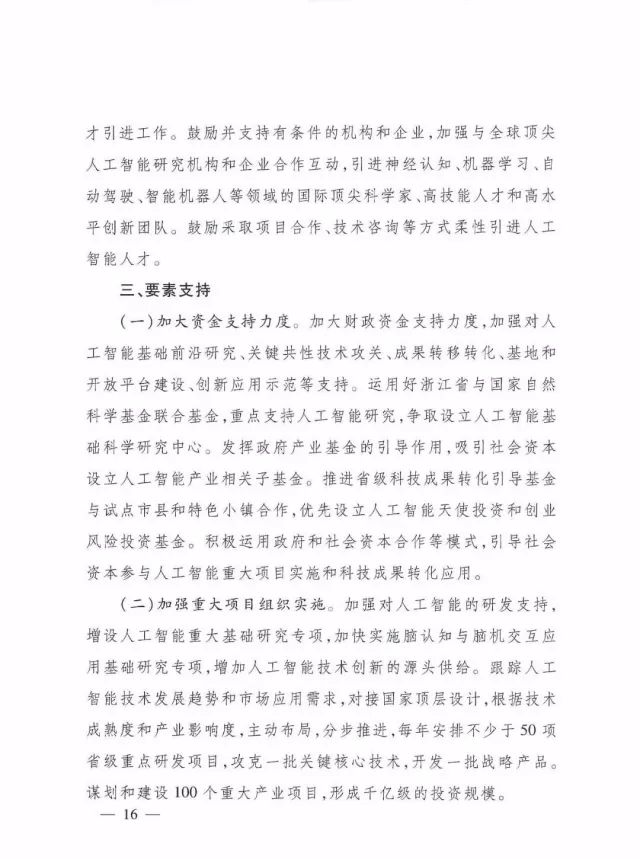 (二)加强重大项目组织实施。加强对人工智能的研发支持,增设人工智能重大基础研究专项,加快实施脑认知与脑机交互应用基础研究专项,增加人工智能技术创新的源头供给。跟踪人工智能技术发展趋势和市场应用需求,对接国家顶层设计,根据技术成熟度和产业影响度,主动布局,分步推进,每年安排不少于50项省级重点研发项目,攻克一批关键核心技术,开发一批战略产品。 谋划和建设100个重大产业项目,形成千亿级的投资规模。
