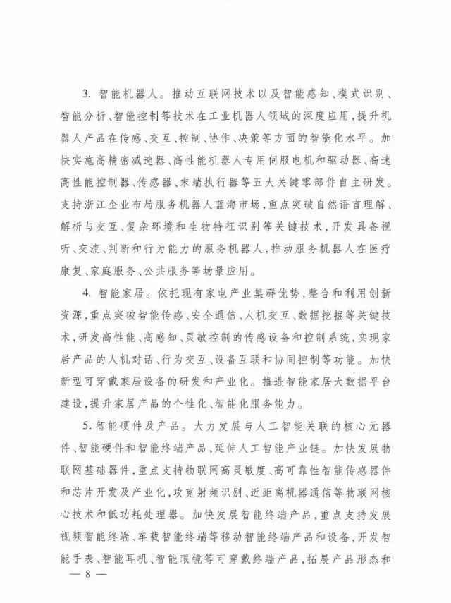 3.智能机器人。推动互联网技术以及智能感知、模式识别、智能分析、智能控制等技术在工业机器人领域的深度应用,提升机器人产品在传感、交互、控制、协作、决策等方面的智能化水平。加快实施高精密减速器、高性能机器人专用伺服电机和驱动器、高速高性能控制器、传感器、末端执行器等五大关键零部件自主研发。支持浙江企业布局服务机器人蓝海市场,重点突破自然语言理解、解析与交互、复杂环境和生物特征识别等关键技术,开发具备视听、交流、判断和行为能力的服务机器人,推动服务机器人在医疗康复、家庭服务、公共务等场景应用。