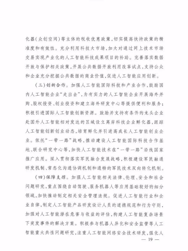 (三)创新合作。加强人工智能国际科技和产业合作,鼓励国内人工智能企业“走出去”,为有实力的人工智能企业开展海外并购、股权投资、创业投资和建立海外研发中心等提供便利和服务;积极引进国际人工智能创新资源。鼓励并支持有条件的龙头企业赴国外人工智能相对发达的区域设立离岸科技企业孵化器,跟踪人工智能创新创业动态,培育孵化并引进高成长人工智能创业企业。依托“一带一路”战略,推动建设人工智能国际科技合作基地、联合研究中心等,加快人工智能技术在“一带一路”沿线国家推广应用。深入贯彻落实军民融合发展战略,积极建设军民融通研发机制、常态化沟通协调机制和通畅的军民技术双向转化机制。